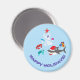 Magnet with cute ocean Christmas theme design. The design consists of a cute shark wearing a Santa hat and carrying Christmas presents, cute green sea turtle and cute red crab. The design is completed by a small white coral arranged as a Christmas tree and decorated with blue, pink and purple seashells and a red starfish. The text says "Happy Holidays!". The design is customisable and you can personalise the text.
