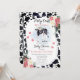 "Holy Cow, It's A Girl!" holstein black and white baby cow calf Baby Shower design featuring pink and white flowers and a black and white cow pattern background. The sweet little calf is sporting a floral bouquet atop her head. Composite design by Holiday Hearts Designs.