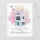 Cute whimsical watercolor house change of address with script typography moving announcement. Whimsical watercolor.