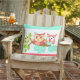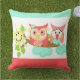 Outdoor pillow with a fun, summery design features two cute hoot owls on a branch and a smiling sun.