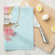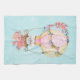 Kitchen towel with an adorable design featuring a watercolor illustration. A hot air balloon decorated wuth pretty red and pink flowers. A cute little white baby bear sits in the basket. Light blue background.