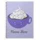 Design featuring vector image of a cute, smiling, purple mug of hot chocolate with whipped cream and heart shaped sprinkles.
