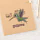 This adorably cute green and purple hummingbird is sharing the love with a bee. Drawn in bright cartoon illustration style.