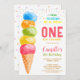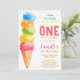 This cute invitation features a watercolor ice cream cone in rainbow colours.