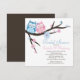 Contemporary couple bridal shower invitation. Our stylish,, trendy & modern owl couple in love wedding shower invitation is set on a square crisp white background with a brown back.Cute pink & blue owls couple sitting on a brown tree branch pink & blue daisy flowers.