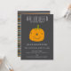 Cute illustrated jack o'lantern, Halloween party invitation. Trendy typography design style template in white text with dark charcoal background and cute colourful striped pattern backing.