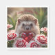 A cute hedgehog holding a red garnet heart sits in a patch of red and white carnations.