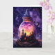 A glass jar containing a glowing house with pointed roofs, set against a starry, dreamy night sky.