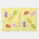 These jelly babies are having sweet fun in blue, green, red, yellow and pink. Drawn in cute cartoon illustration style on a bright yellow polka dot background.
