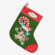 A mischievous grey racoon juggles red, green, and blue Christmas tree bulbs on the front of this bright and colourful stocking. The racoon wears a red and white striped, long stocking hat. The image is placed on a Holiday green background, and the toe and top border are a red and white snowflake pattern. On the top border is a white label with your custom text in green. The back of the stocking is the same red and white snowflake pattern. Cute!