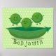 These 3 garden peas are having fun as they jump in their pod! Drawn in cute cartoon illustration style on a light green polka dot background.