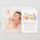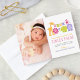 A parade of jungle animal friends — lion, giraffe, bird, monkey, elephant, and hippo — welcomes your baby girl on this delightful portrait-format safari birth announcement card. The portrait photo is surrounded by polka dot and stripe pattern accents on a clean white background with pops of vibrant pink, green, orange, and purple. All text is fully customisable.