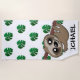 This cute sloth is hanging out and waiting to play. Behind him is a white background with a jungle leaves pattern. Underneath him is the name of your child, who is playing in the rainforest with him. Add a cute buddy to your child's bath time!