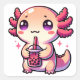 Cute pink axolotl holding a boba or bubble tea Kawaii cartoon.