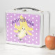 For fruity, fun lunch times! This happy banana is dancing away in cute cartoon illustration style on a light purple spotty background!