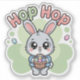 A delightful bunny with a basket of decorated Easter eggs and playful “Hop Hop” lettering above, created in a soft kawaii cartoon style that feels lighthearted and joyful. This Easter illustration brings a sweet seasonal charm to spring-themed items and gifts.