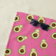 Adorable avocado patterned beach towel features an allover pattern of smiling and winking kawaii avocados in a cartoon style, on a bright summery pink background. A cute and trendy design that's perfect for avocado lovers or kawaii fans, you can personalise this quirky chic beach towel with a name along the bottom.