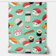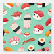 A fun, colourful kawaii sushi pattern featuring adorable sushi rolls, nigiri, and maki with smiling faces on a pastel green background. Perfect for food lovers, especially those who enjoy cute and playful Japanese themes. Ideal for gift items, stationery, and more!