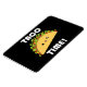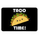 A cute flexi magnet featuring a yummy kawaii taco with ground beef, lettuce, tomatoes, and cheese, smiling on a black background between the words "Taco Time!" in white Bahaus 93 font. A cute gift for taco lovers, fans of Japanese pop art, or anyone who enjoys humourous kawaii!