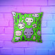 Green background with cute purple Kawaii characters and lavender flowers on this square throw pillow.