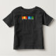 Cute kids tee with Greetings in Māori from Aotearoa New Zealand. On the front is "Kia Ora" meaning hello, and on the back is "Ka kite", meaning "See you again". The words of the back, the good-bye greeting, are in matching colours to those on the front but with a slightly different design. The design on the front, is a friendly Kiwi greeting used frequently by NZ Kiwis. This phrase is designed with the letters all in capitals and in a white colour. Partially behind each letter of the words are coloured rectangles bringing vibrant colour to the pattern. The image is placed on a black background. The rectangle colours are orange, red, yellow, blue and green.