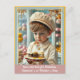Artsy postcard with unique illustration, featuring cute little child handing out various delicious gourmet bites, sweets on a plate.