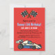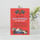 Organise a race car birthday party for a birthday boy who love racing cars and toys! This kids birthday party invitation comes with colourful and cute racing elements which include the race colours of blue, red, black and white and doodle drawings of chequered flags, a blue and white sports car with a little racer inside and even the invitation write up where the venue is named tongue in cheek as a race track and the phrase "race over to". Personalise with your party details including the number on the car!