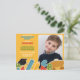 Cute Kindergarten graduation party invitation postcard. School bus yellow background with graphical school supply icons. Large central photo (placeholder to be replaced). Modern whimsical typography in multiple colours pulling from card details. Sophisticated yet youthful. Cute graduation announcement and invitation. Great keepsake announcement of a spectacular step in one's educational journey.