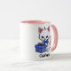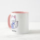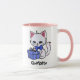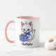 Cute kitten illustration on a white mug with pink handle and interior. White kitten with pink ears and a blue bow tie holding a blue package with a bow. The name at the bottom can be changed or removed. This cute mug is available in many sizes and styles and the handles/inside colour can be changed or made to be all white.