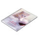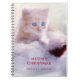 Spiral notebook personalised with your name or title. Designed with a photograph of a ginger kitten sitting on a soft white and red Santa hat. Blurry glittering lights bokeh background. Funny pun - Meowy Christmas. Text is editable so you can change it so say whatever you like.