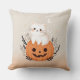 Add a playful touch to your Halloween décor with this cute Halloween-themed throw pillow featuring an adorable illustration of a white cat sitting on an orange jack-o'-lantern pumpkin, surrounded by foliage, stars, and a glowing moon. This charming design brings a festive yet whimsical vibe to your home, making it the perfect accent for Halloween celebrations. Cosy up in style with this Halloween cat and pumpkin throw pillow, ideal for adding a fun and seasonal touch to your space.