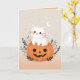 Send charming Halloween greetings with this cute Halloween greeting card featuring an adorable white cat sitting on an orange jack-o'-lantern pumpkin, surrounded by foliage. The background showcases a whimsical scene with stars and a crescent moon, set in soft pastel tones that give the card a sweet and festive feel. Perfect for those who enjoy a mix of cute and spooky, this pastel Halloween card is ideal for adding a playful touch to your Halloween celebrations.