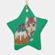 This cute little Christmas tabby kitten is wearing a very pretty red bow with a christmas holly on her head and she's looking very pleased with herself as she licks the Christmas pudding cream from her paws with her little pink tongue. Her big pussycat eyes show how much she's enjoying her special christmas treat. This original and cute christmas ornament has a festive red background colour on one side and a very seasonal green background colour on the other side, the red side has a digatally enhanced kitten image, I've given it an engraved appearance. The green side of the star shaped ornament has the originsl water-colour picture of the little tabby cat I think this festive star ornament makes a wonderful little gift for anyone, friends, family, colleagues and all cat lovers will will be pleased to recieve this very special christmas ornament during the holiday season. Or maybe you just want to treat yourself to a cute christmas kitten premium ornament.