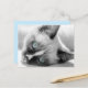 Postcard featuring a blue-eyed white kitten with a white stripe down his nose. Photo taken in Pasadena, California.