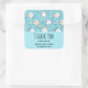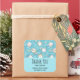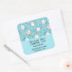 Party thank you stickers with a cute cat pattern, set on a blue background and decorated with rainbows and paw prints and more.