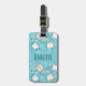 A luggage tag with a cute cat pattern, set on a blue background and decorated with rainbows and paw prints and more.