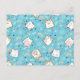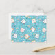 A postcard with a cute cat pattern, set on a blue background and decorated with rainbows and paw prints and more.