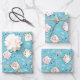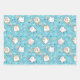 Wrapping paper sheets with a cute cat pattern, set on a blue background and decorated with rainbows and paw prints and more.
