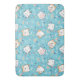 A bath mat with a cute cat pattern, set on a blue background and decorated with rainbows and paw prints and more.