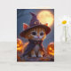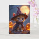 A cute kitten wearing a witch costume for Halloween. The pumpkins vary in size and glow with a gentle orange light. The background is a cosy night scene. Pretty, custom Halloween card for everyone!