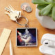This key chain is adorned with an adorable tabby cat sitting in rafters photograph that has been digitally altered giving it a glowing appearance. Fill in the template field with a name, initials, remove the text or click Customise it! to select a font style, size and colour you prefer. Under Shape and Size Options you can select this design on the different size or shape.