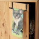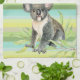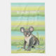 Cute kitchen towel, with watercolor Koala bear illustration on striped: green, teal, yellow, sand colour background, featuring a custom text/ name at the top. Easily amend or delete any of the texts by clicking on the Personalise button.