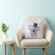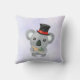 A pillow with an illustration of a cute grey koala eating some eucalyptus leaves, wearing a fancy black top hat with a red ribbon. Set on a light purple digital watercolor background.