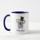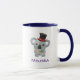 A coffee mug with an illustration of a cute grey koala eating some eucalyptus leaves, wearing a fancy black top hat with a red ribbon. Personalise with a name.
