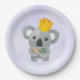 Paper plates with an illustration of a cute grey koala eating some eucalyptus leaves, wearing a fancy golden crown. Set on a light purple digital watercolor background.