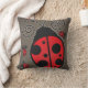 An adorable throw pillow with ladybugs roaming around the pillow. The background of the pillow is a brownish grey colour. Very cute and fun.