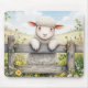 A fluffy lamb leans on a wooden fence surrounded by colourful wildflowers under a bright blue sky