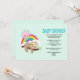 Baby shower invitation with an illustration featuring a cute brown sloth happily lazing on a tree branch. A colourful rainbow behind him along with a pink sun hovering over head. Cute, adorable and trendy.
