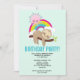 Birthday invitation with an illustration featuring a cute brown sloth happily lazing on a tree branch. A colourful rainbow behind him along with a pink sun hovering over