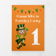 An adorable invitation for your special boy or girls first birthday featuring a ginger haired leprechaun doing a jig at finding a lucky shamrock. He is wearing a vibrant green and faux gold outfit and has orange and green bunting above his head and rainbow coloured confetti around him. The inside includes an invitation and two games. The first is the time capsule to be opened on his / her 18th birthday and the second is a game of firsts. Make sure to ask your guests to complete the time capsule prior to the party and to only play the firsts game with everyone at your Childs birthday.